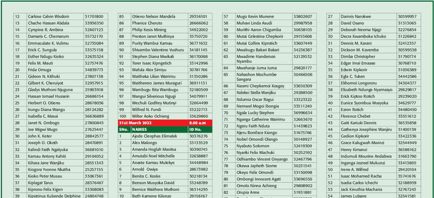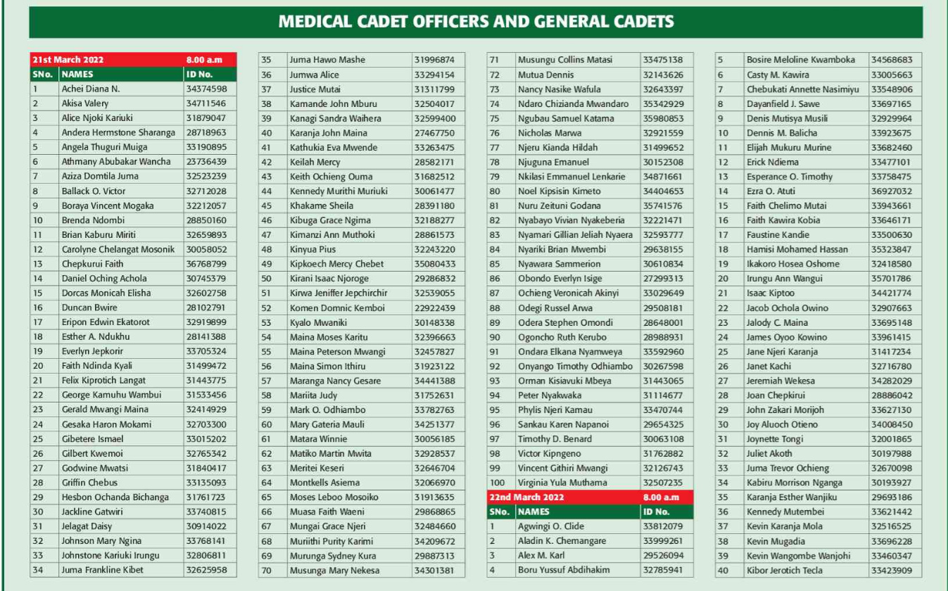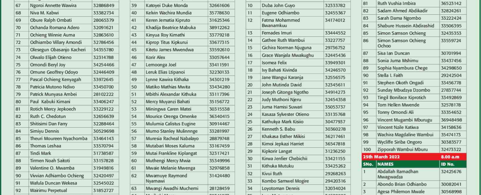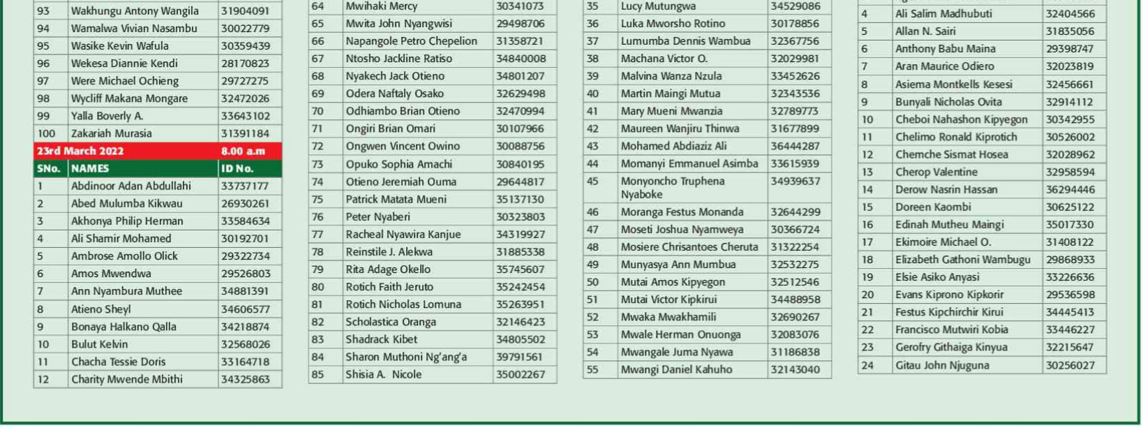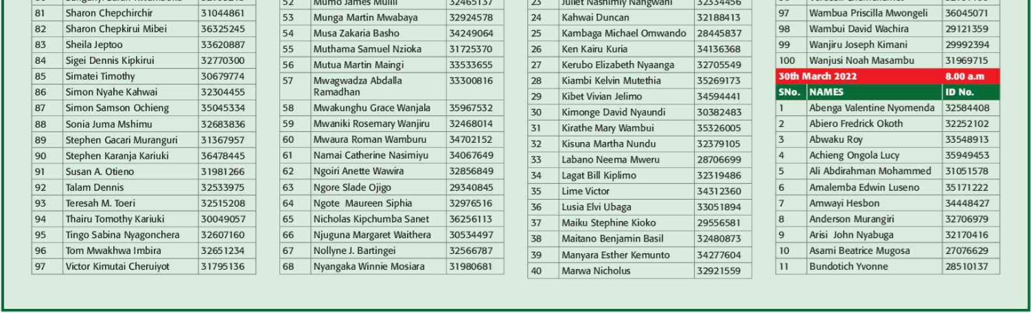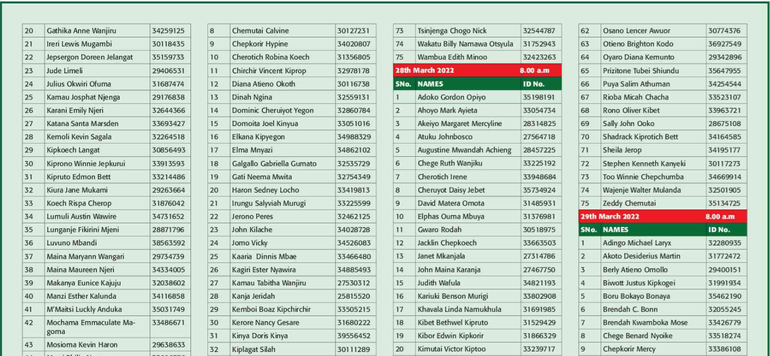 Prospective candidates must carry their original identification card, birth certificate, KRA PIN certificate, academic certificates and other testimonials on the day of recruitment.