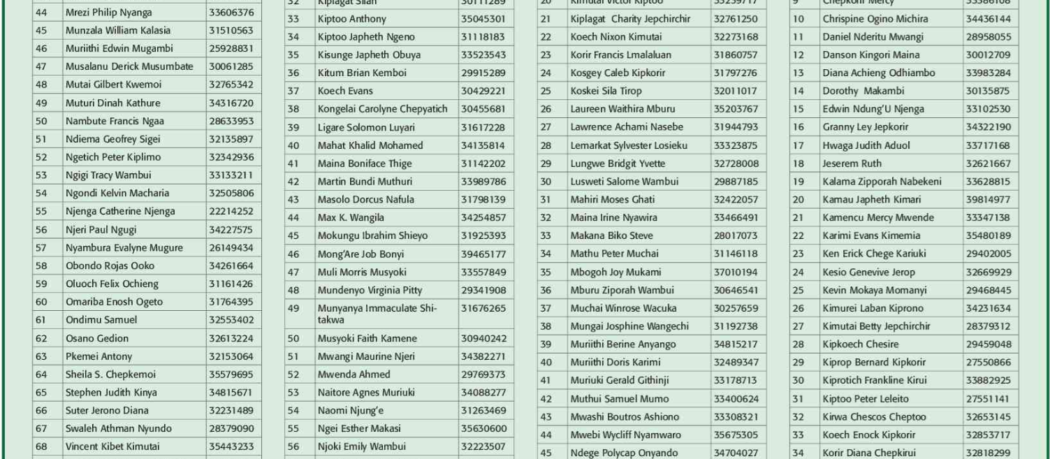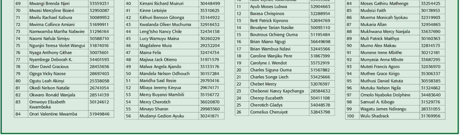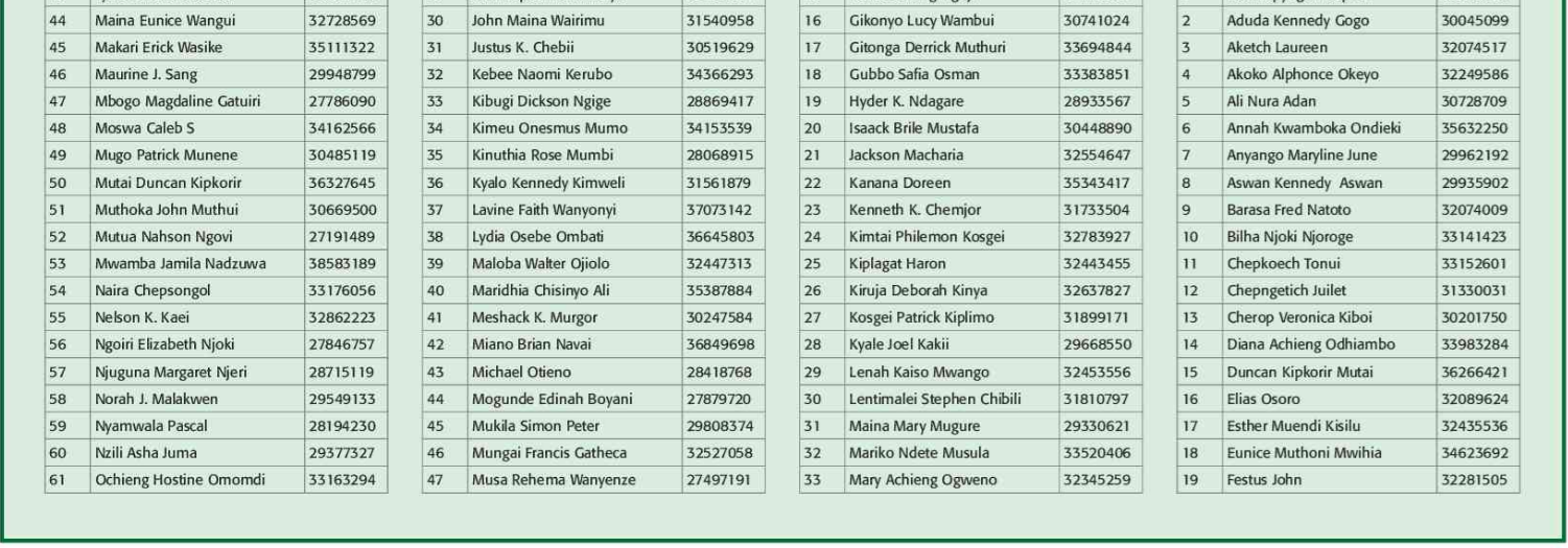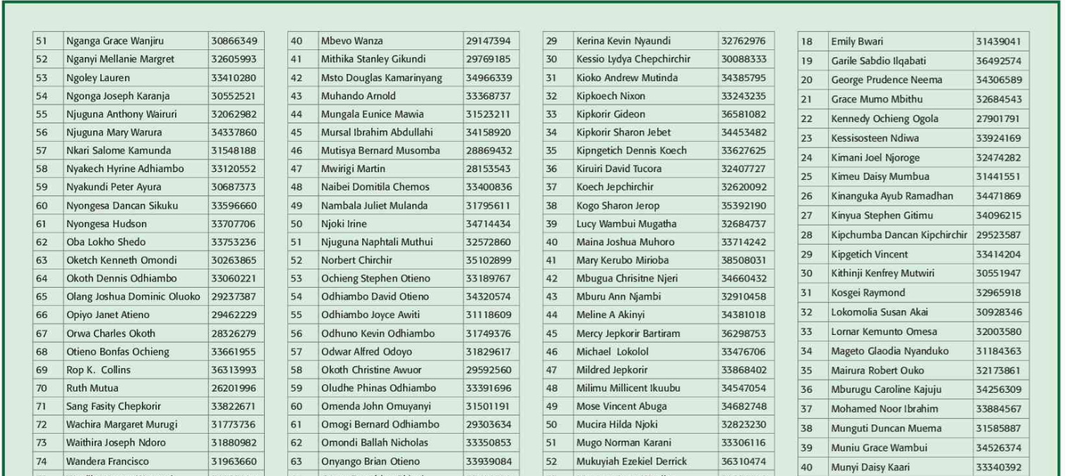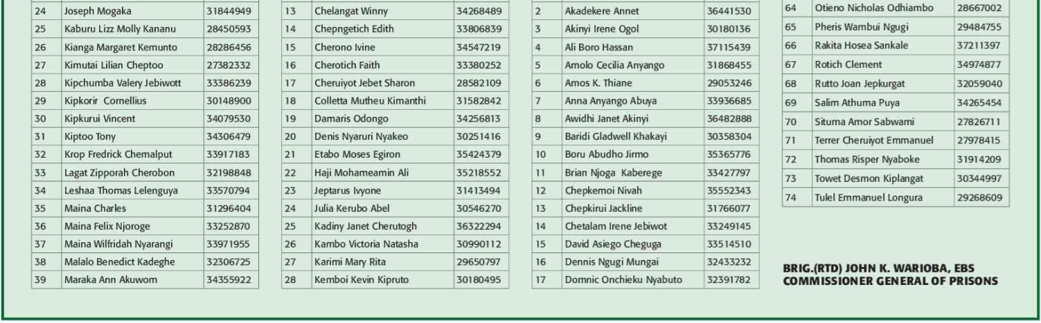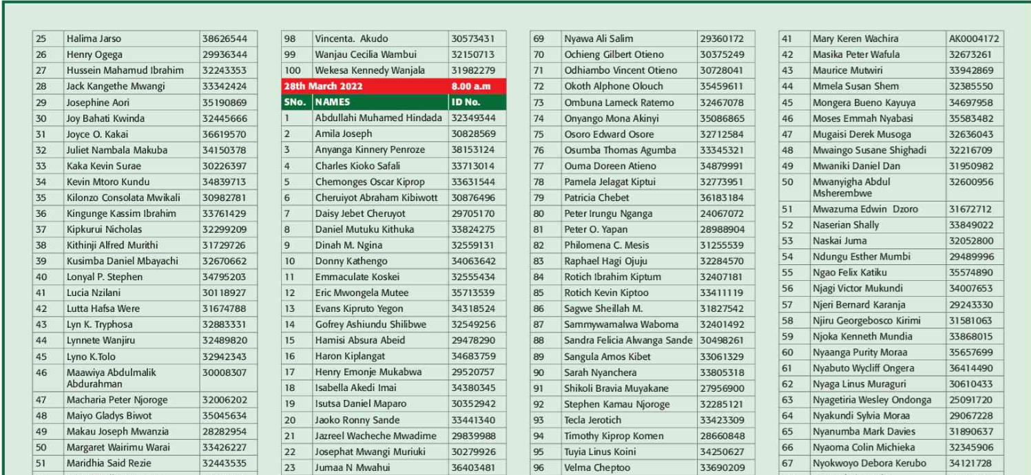 Prospective candidates must carry their original identification card, birth certificate, KRA PIN certificate, academic certificates and other testimonials on the day of recruitment.