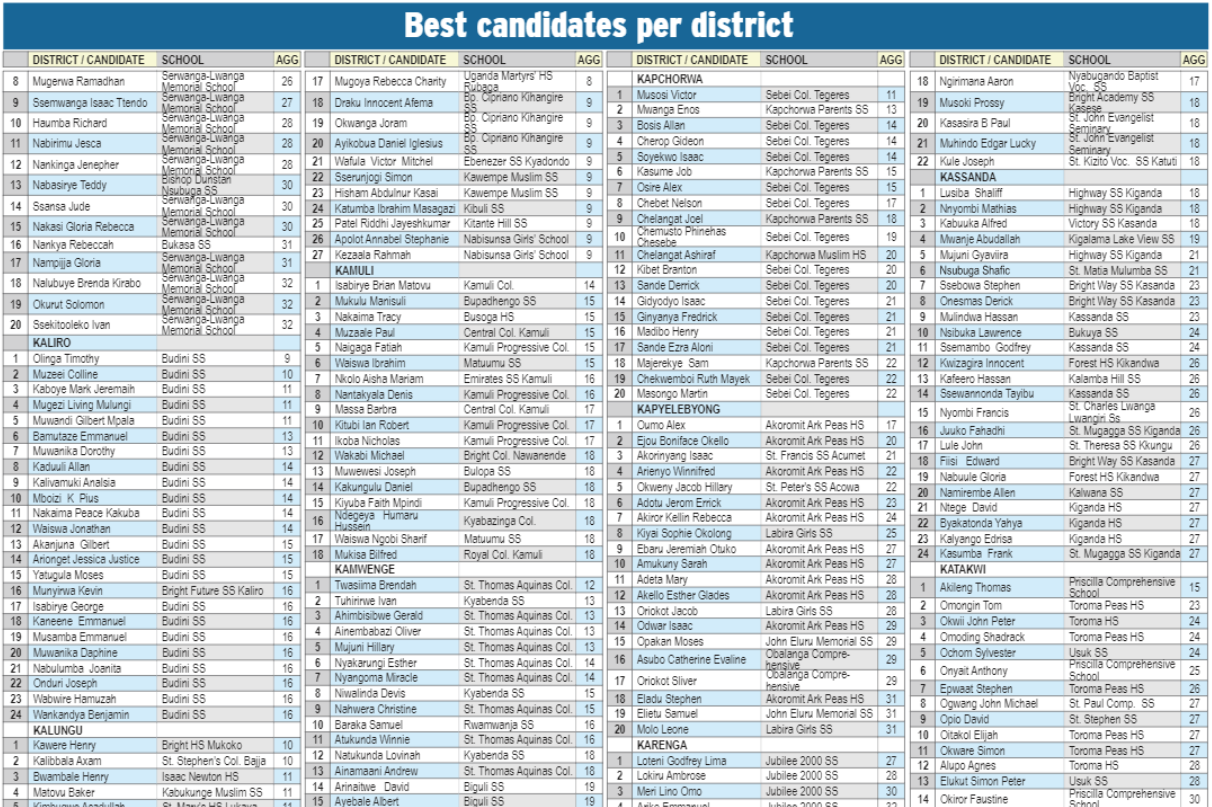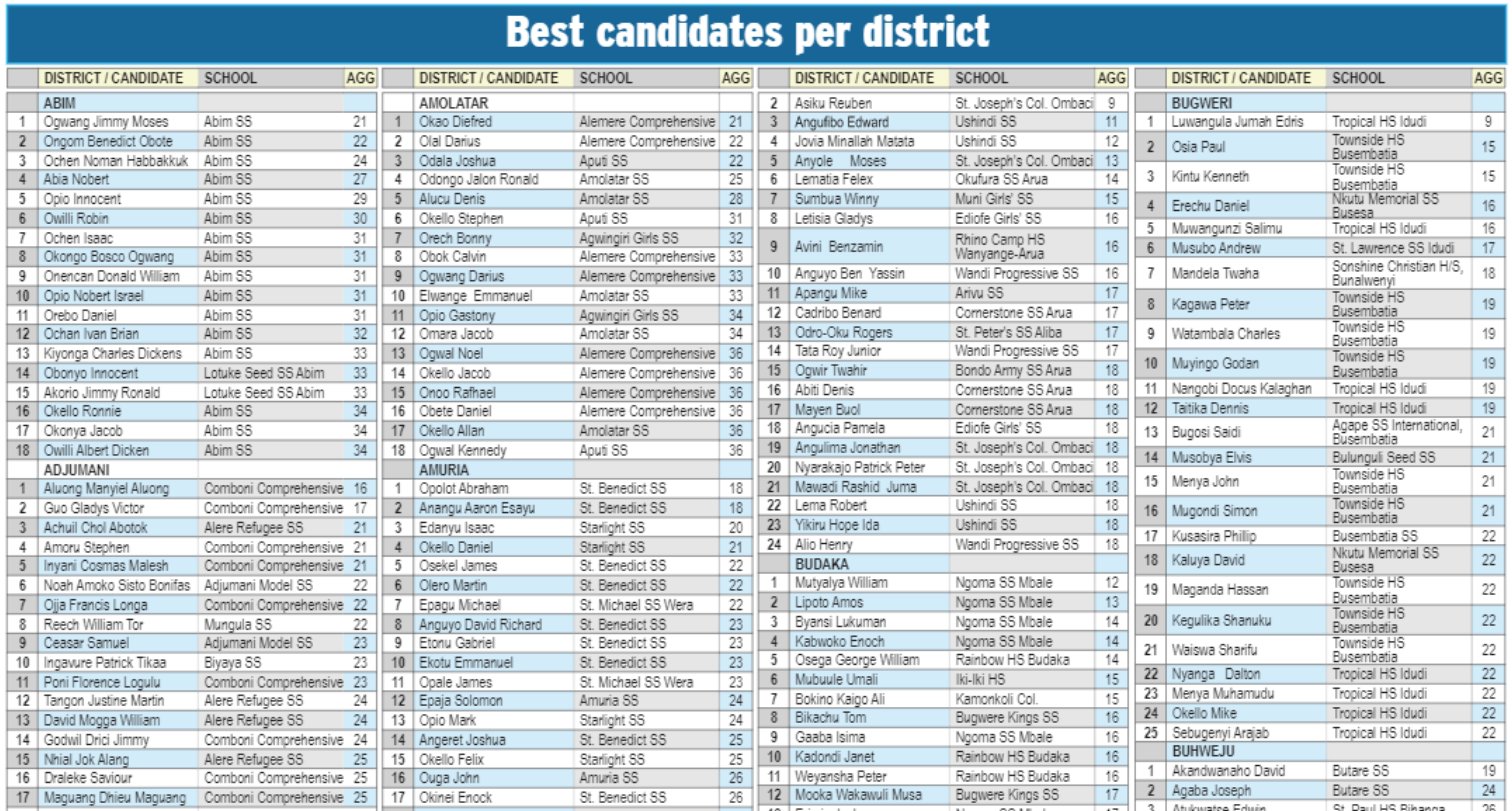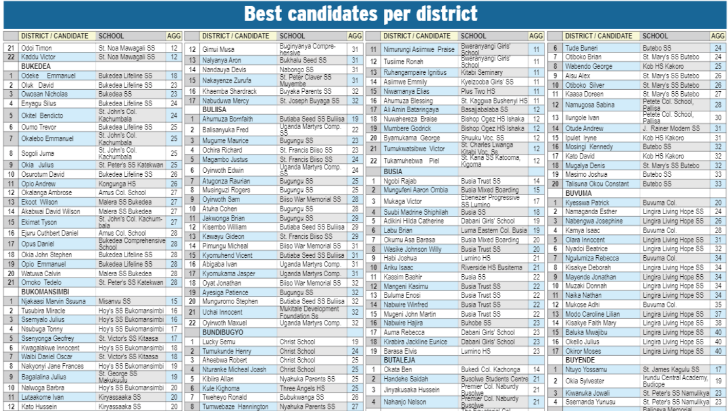 2020 PLE Best Schools Per District (Ranking by Average Aggregate Score)