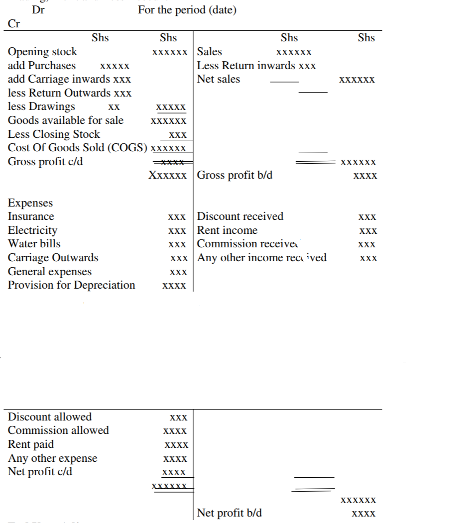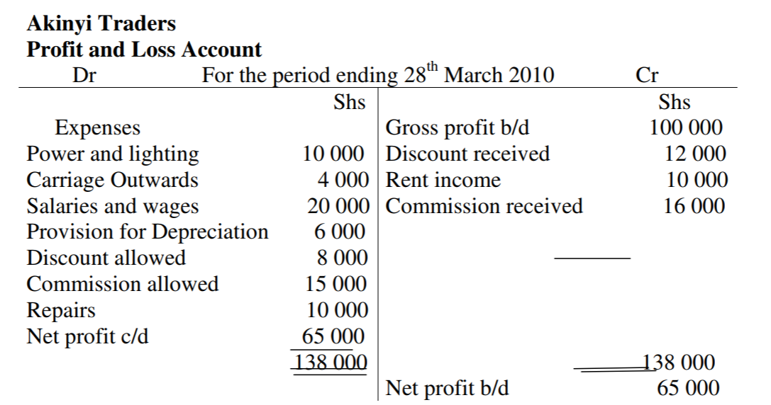 Profit and Loss accountIn preparation of this account, the gross profit is brought down on the credit sides, with all other revenues/income of the business being credited and the expenses together with the net profit being debited. Net profit = Total