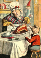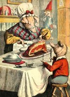Here you see him sitting down with clean hands and face, to some nice roast beef, while his brother, the idle pig, who is standing