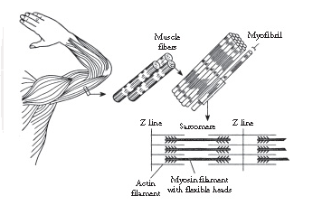 As shown in the Figure below a muscle cell contains a series of ultramicroscopic filaments called myofibrils.