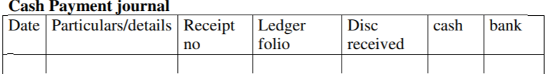 This is used to record cash and cheques that have been issued to the creditors/out of the business. Its totals are credited (Cr) in the cash and bank account and the individual accounts are debited (Dr) in their respective
