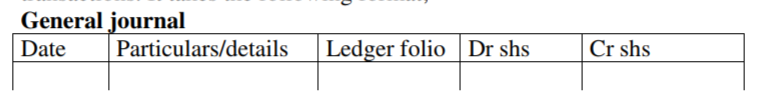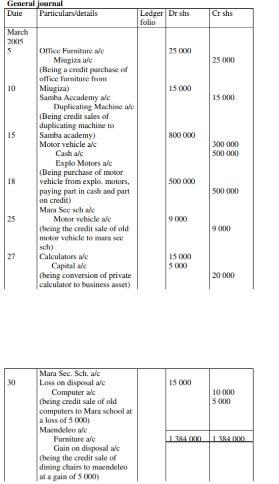 For example:Journalise then following transactions which took place in the business of J Opuche during the month of March 2005 March 5; Purchased office furniture on credit for shs 25 000 from miugiza