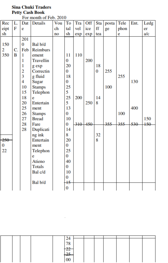 For example:A petty cashier of sina chuki traders operate a petty cash book on an imprest of kshs 2 500 on a monthly basis.