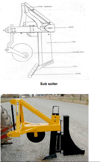 The sub-soiler consists of heavier tyne than the chisel plough to break through impervious layer shattering the sub-soil to a depth of 45 to 75 cm (Fig.3) and requires 60 to 100 hp to operate it.