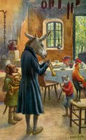 Before long they came to a cat, sitting on the path, with a face like three rainy days! "Now then, old shaver, what has gone askew with you?" asked the donkey.