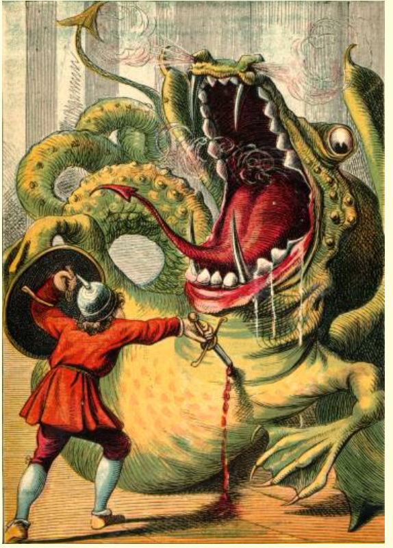 Strong-arm, nothing daunted, soon found the monster, who was fast asleep, so he made short work of him by sending his sword right through his