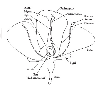 The pistil consists of a sticky stigma; a style, which is a narrow stalk connecting the stigma to the top of the ovary; and the ovary, which is where the ovules are enclosed.